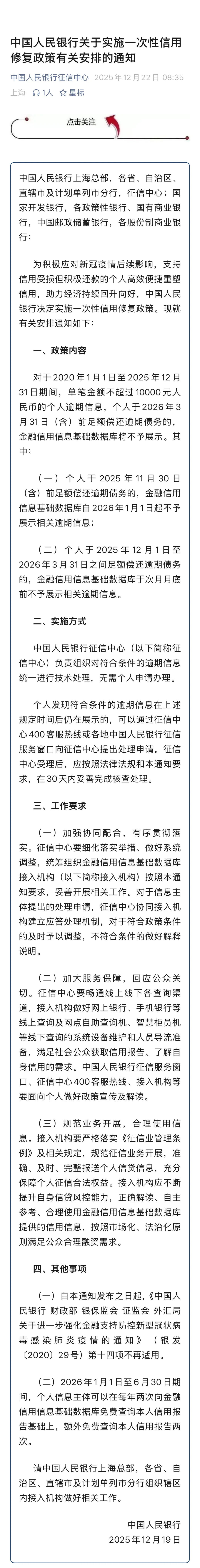 2025年底,一条爆炸性消息在金融圈炸开锅:央行宣布针对特定逾期记录推出“一次性信用修复”政策!简单来说,只要满足条件,你的征信报告能自动“洗白”,彻底告别逾期黑历史。消息一出,不少负债人直呼“救命稻草来了”。